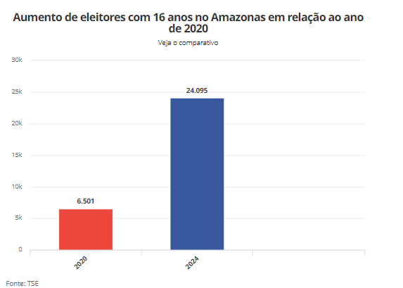 O número de eleitores de 16 anos no Amazonas aumentou 270% desde as eleições de 2020, passando de 6.501 para 24.095 jovens aptos a votar pela primeira vez. Agora, esses eleitores representam 0,88% do total do eleitorado do estado, comparado a apenas 0,26% há quatro anos, segundo o Tribunal Superior Eleitoral (TSE).
