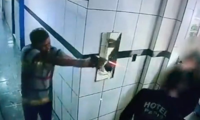 No vídeo, é possível ver a ação dos dois suspeitos dentro do estabelecimento. Um deles aparece inicialmente e analisa a vítima. Em seguida ele vai até uma porta, que seria de um cômodo do hotel, e faz um sinal chamando o atirador.