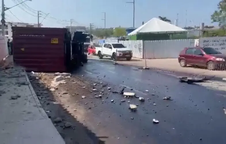 Caminhão com contêiner tomba e derrama óleo na avenida Autaz Mirim