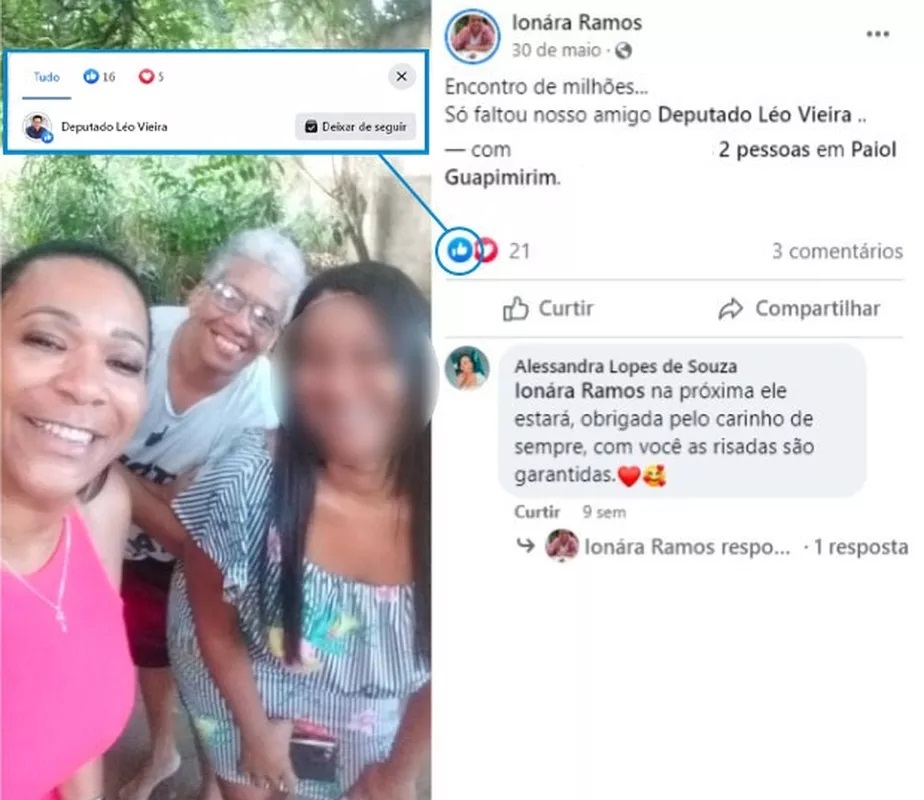 Apontada como uma das 36 pessoas que receberam transferências ou sacaram mais de R$ 20 mil do Ceperj, a cozinheira Ionara Ramos publicou em suas redes sociais uma foto com ex-vereadora de Guapimirim, pelo Patriota, Alessandra Lopes. Na postagem, feita 25 dias após a ordem de pagamento de R$ 21.029,79, ela escreveu que aquele era um “encontro de milhões”, mas faltou a presença do “amigo deputado Léo Vieira”. O parlamentar é da base aliada do governo Claudio Castro na Assembleia Legislativa do Rio (Alerj) e ex-secretário de Trabalho e Renda. A pasta possui parceria com o Ceperj no programa Casa do Trabalhador, um dos alvos da investigação do Ministério Público.