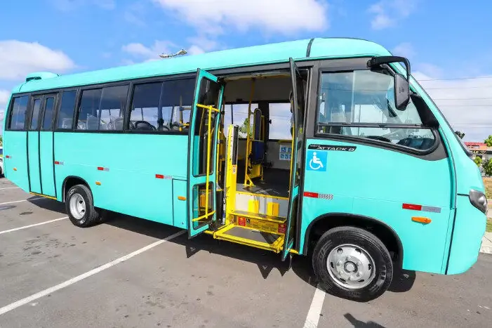 O micro-ônibus tem ar-condicionado, elevador de acessibilidade e motor Euro 6, tecnologia que promete reduzir o consumo de combustível e as emissões de poluentes.