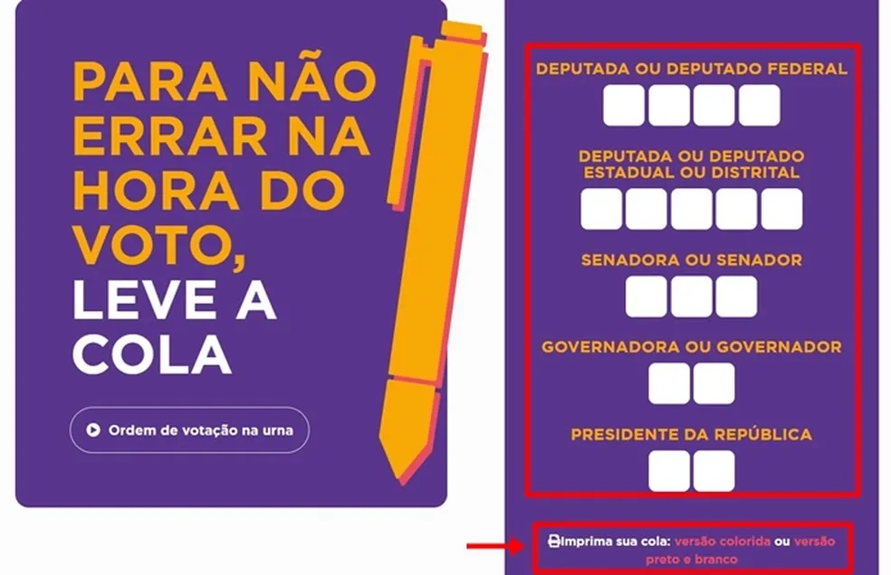 Passo 2. Será aberto o arquivo da colinha eleitoral para ser impresso. Nele, é possível ver a ordem de votação com os espaços em branco, para que o eleitor preencha os números à mão. Para imprimir a cola, selecione uma das opções: “versão colorida” ou “versão preto e branco”;