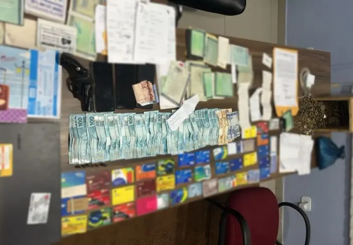 Durante a operação policial, foram apreendidos cerca de R$ 9 mil em espécie, uma arma de fogo, 45 cartões bancários e documentos de veículos retidos de vítimas.