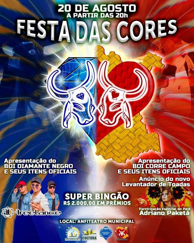 Os bumbás Corre Campo e Diamante Negro agitam a noite deste sábado (20) com a tradicional Festa das Cores no anfiteatro municipal da cidade, Nova Olinda do Norte fica a aproximadamente 130 quilômetros de Manaus.