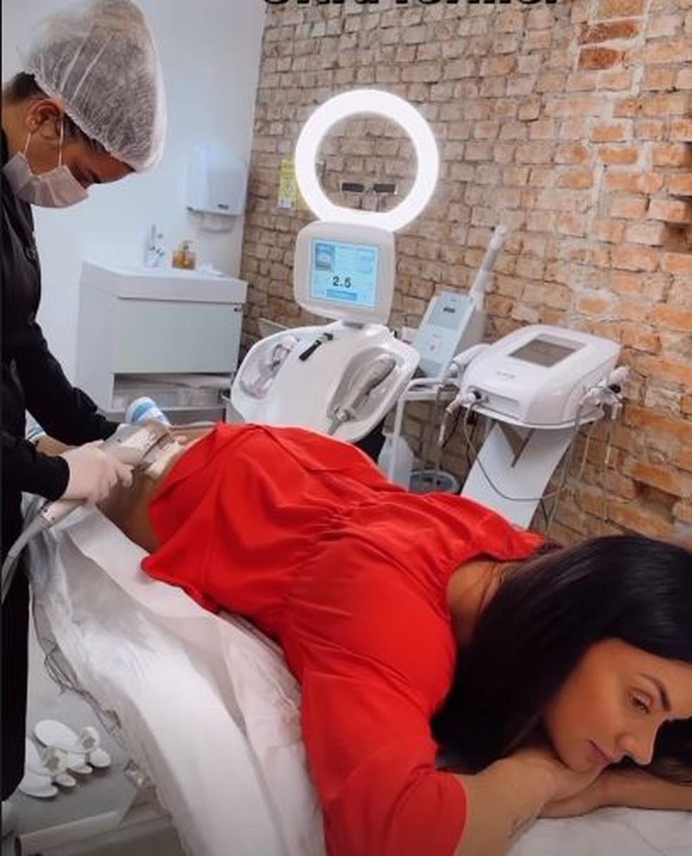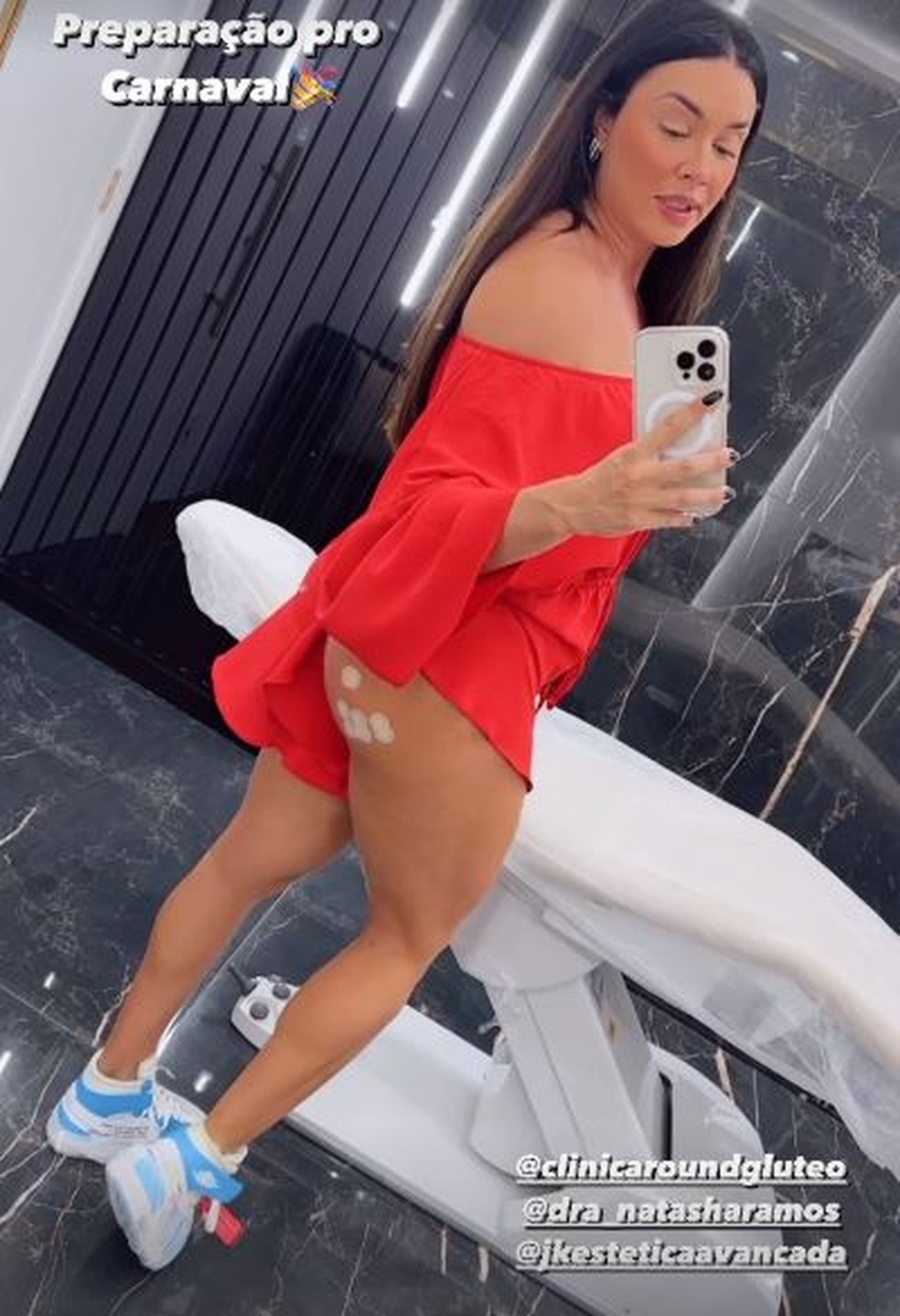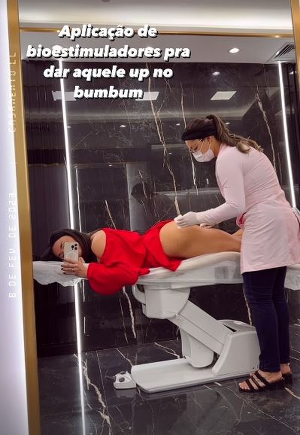 “Aplicação de bioestimuladores pra dar um up no bumbum”, indicou em uma das publicações. No momento seguinte, ela explica: “Hoje a gente fez aplicações de bioestimuladores na parte debaixo do bumbum para dar aquela levantada e sustentação”.