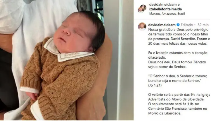 David Benedito, filho do prefeito de Manau, morreu após 20 dias de nascimento. A informação foi confirmada pelo prefeito nas redes sociais, nesta sexta-feira (23). A criança era fruto do relacionamento com Izabelle Fontenelle. A causa da morte não foi divulgada.