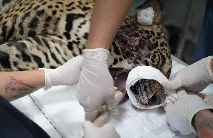 A onça-pintada que foi resgatada após ser vista nadando por horas no Rio Negro, em Manaus, na quarta-feira (1º), estava ferida após ser baleada com um tiro de espingarda na cabeça. A informação foi confirmada pela equipe de veterinários que presta assistência ao animal.