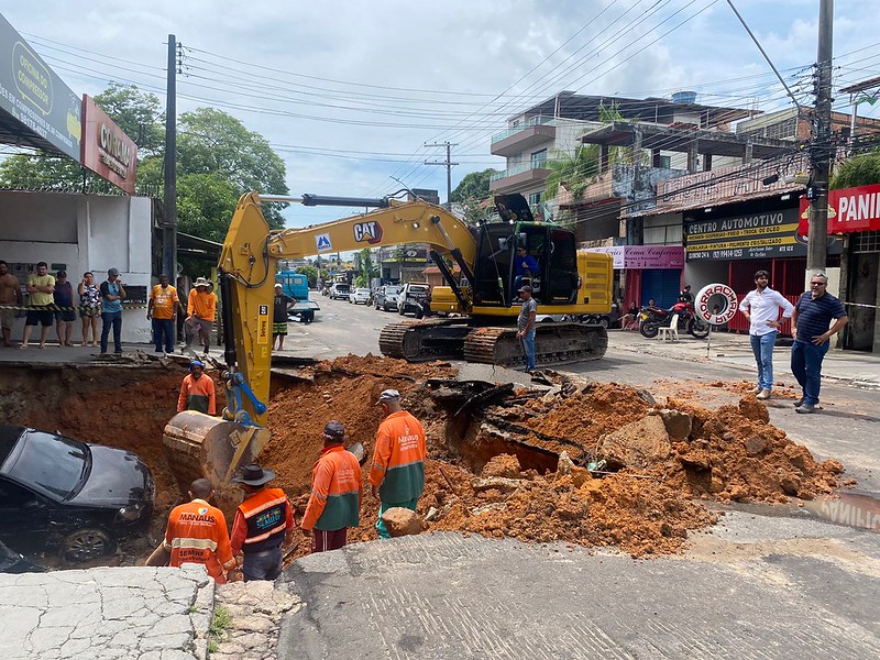 A Prefeitura de Manaus, por meio da Secretaria Municipal de Infraestrutura (Seminf), avança nesta sexta-feira, 9/12, com a obra emergencial de recuperação da tubulação de drenagem profunda, na avenida Atlântica, localizada no bairro Raiz, zona Sul da cidade, após um trecho da rua ter cedido com as fortes chuvas da última semana.