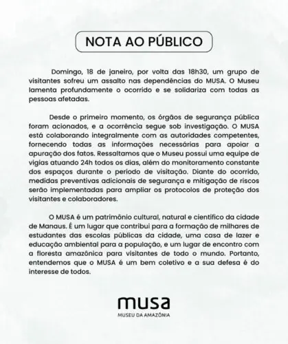 Por meio de nota, o musa informou que os órgãos de segurança pública foram acionados no primeiro momento, e a ocorrência seguem em investigação.
