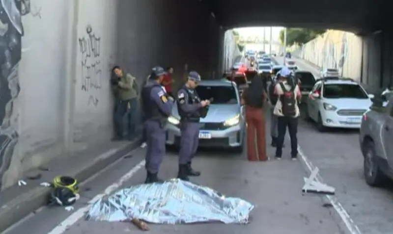 Com o impacto da queda, o veículo se arrastou pela pista e a vítima foi arre