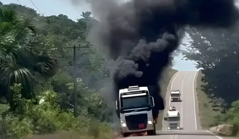 Imagens registradas por um motorista que passava pelo local mostram o veículo envolto em uma densa nuvem de fumaça preta enquanto ainda se movimentava lentamente pela rodovia.