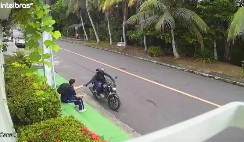 Por volta das 6h, a vítima estava sentada em uma calçada mexendo no celular. Em um determinado momento, o criminoso aparece na motocicleta e toma o aparelho da mão do estudante.