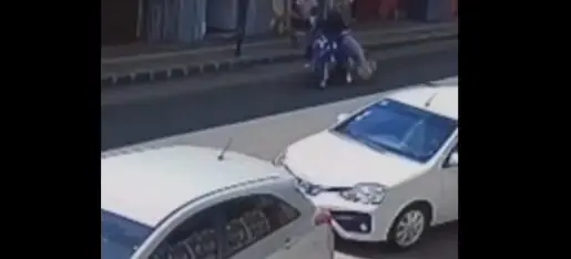 Nas imagens, é possível ver o momento em que o suspeito e um comparsa tentam fugir em uma motocicleta, quando um homem arremessa um tijolo contra um deles.