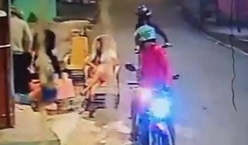 As gravações mostram um grupo de pessoas reunido na calçada quando quatro suspeitos, em duas motocicletas, se aproximam e param.