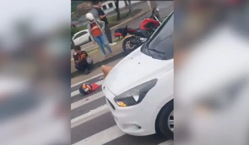 Motorista e outros motociclistas que trafegavam pelo local cosneguiram registrar o motociclista sentado na calçada e uma mulher caída no chão.