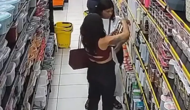 Em seguida, a mesma mulher retira uma sacola plástica do bolso e junto com a comparsa, começam a recolher os produtos. Após circularem dentro da loja e recolherem os itens, as suspeitas vão embora da loja.