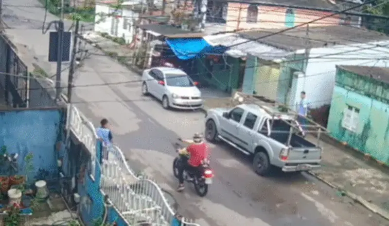 A ação criminosa foi registrada por câmeras de segurança. Por volta das 5h42, dois trabalhadores estavam caminhando pela rua quando um motociclista apareceu trafegando na rua.