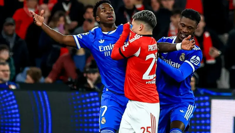 Os jogadores do time português foram tirar satisfações com Vini Jr, que recebeu cartão amarelo do árbitro François Letexier. Quando a confusão parecia encerrada, o brasileiro se dirigiu ao juiz reclamando que foi chamado de “mono”, termo em espanhol para macaco. Ele tinha acabado de discutir com Gianluca Prestianni, do Benfica. As imagens da transmissão de TV mostraram que, em certo momento, o atacante argentino colocou a camisa em direção à boca.